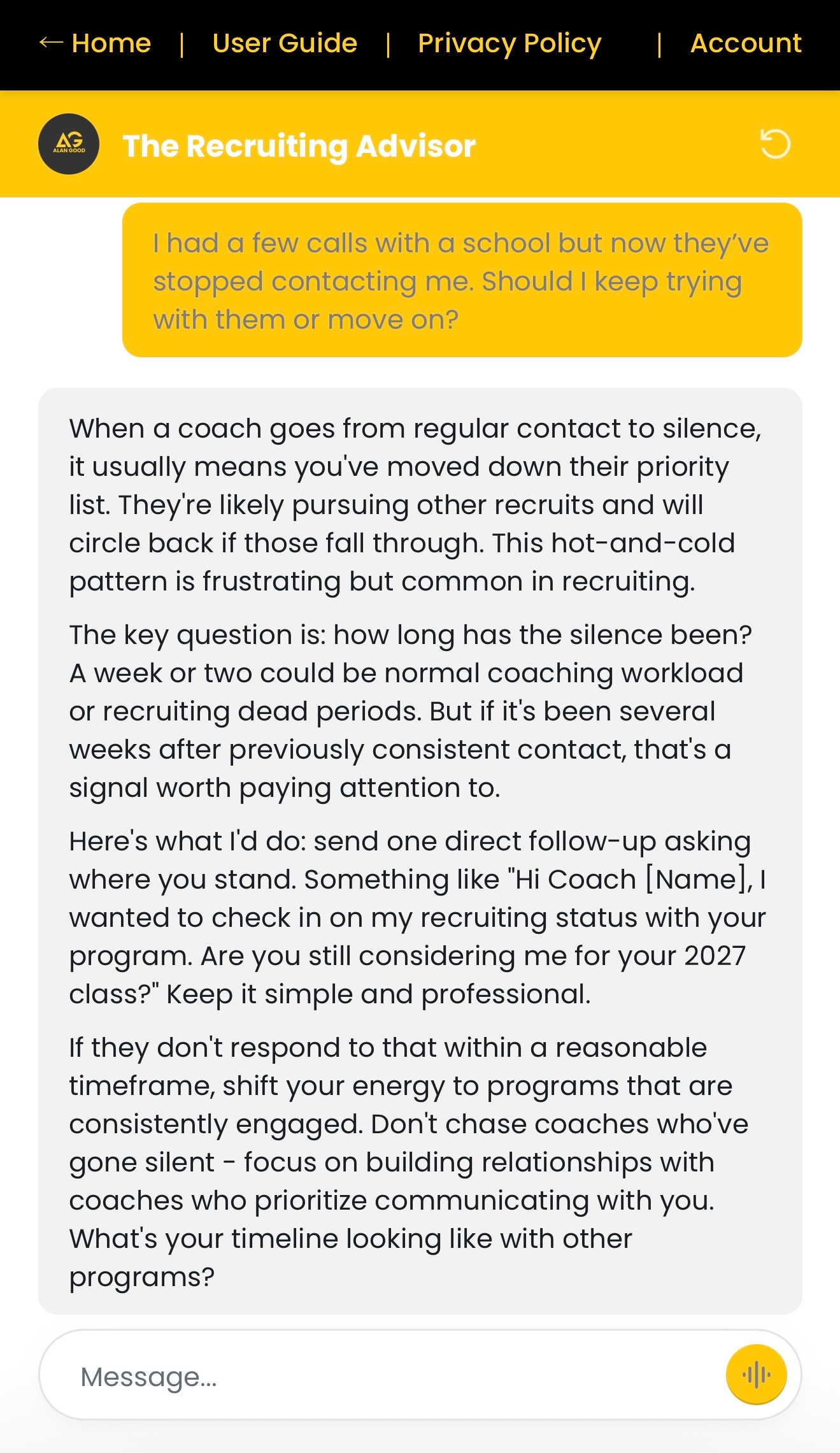The Advisor helps you understand recruiting patterns, decode coach communication, and build strategy. It’s trained on my methodology and can answer questions at 2am when you can’t sleep.