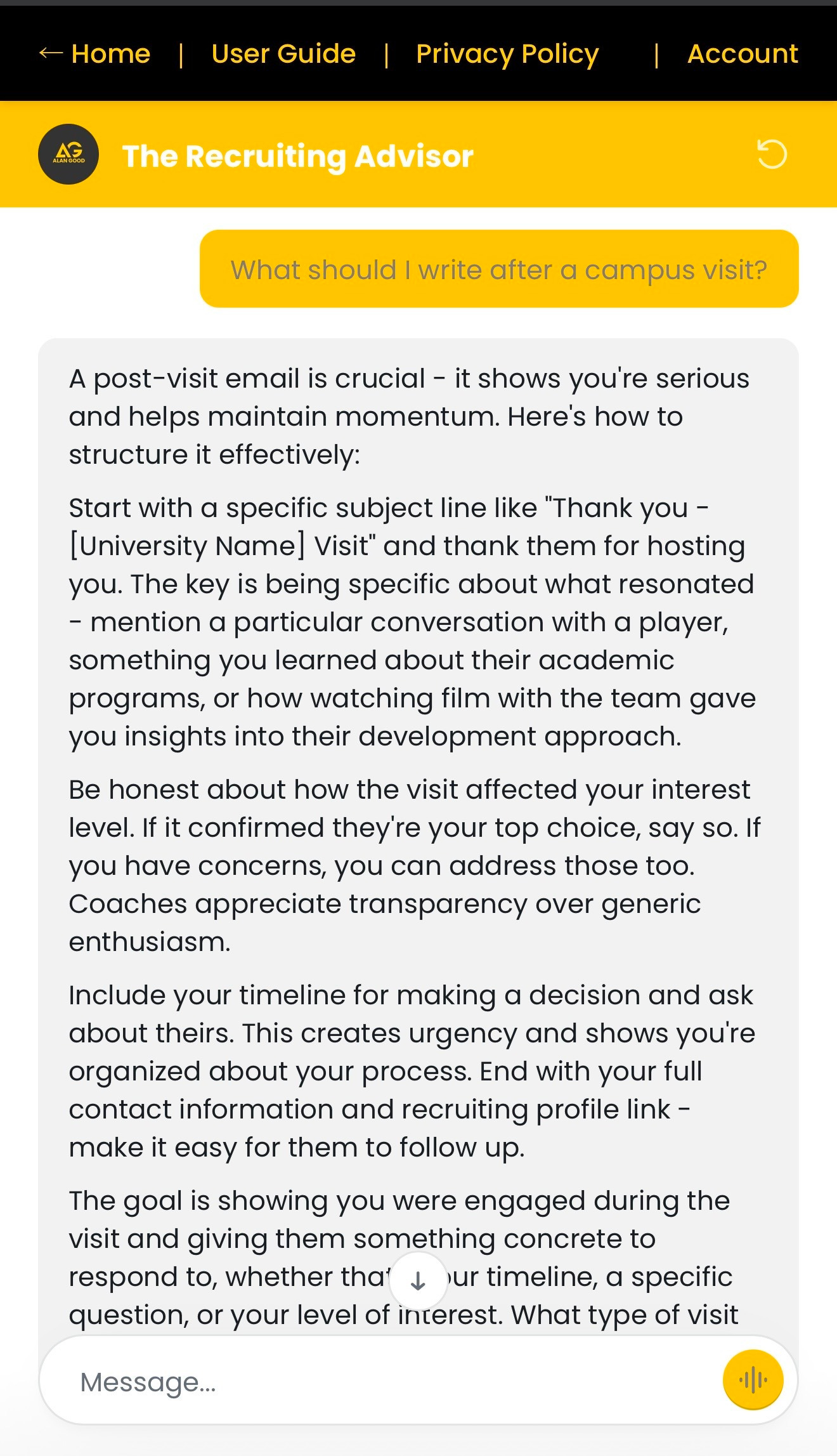 It’s not me personally coaching you through the AI. But it is trained on how I think about recruiting, what I’ve learned from 10+ years on both sides of the desk, and the framework I use to help families navigate this process.