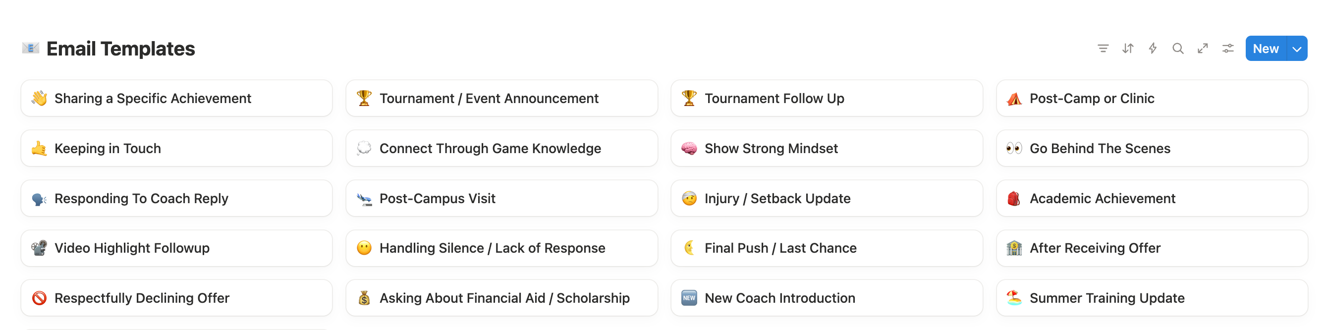 ...and 14 more covering everything from first contact to summer training updates, all in an easy-to-access Notion database: